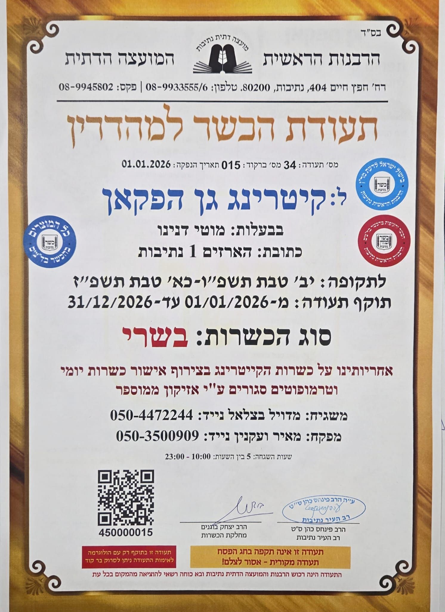 קייטרינג גן הפקאן - הכשרות שלנו